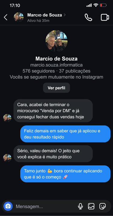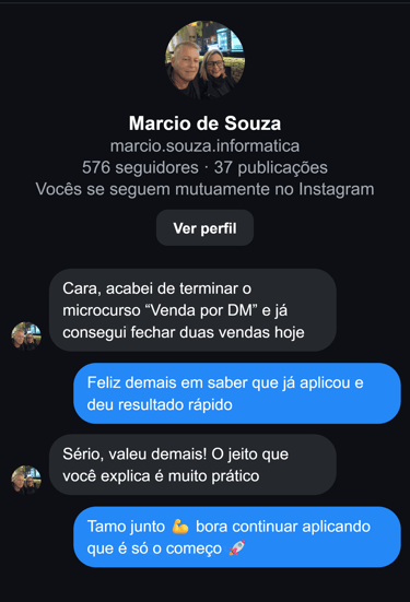 "Terminei o microcurso Venda por DM e já consegui fechar duas vendas hoje" - Marcio