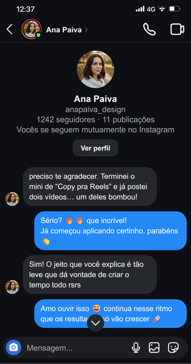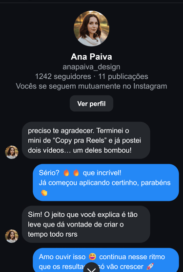 "Terminei de “Copy pra Reels” e já postei dois vídeos… um deles bombou! 😍" - Ana